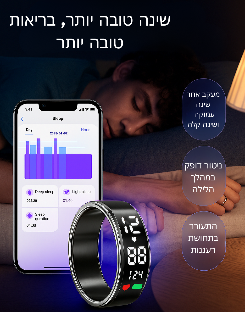 עקוב אחר שינה עמוקה וקלה, עקוב אחר דופק הלב שלך במהלך הלילה, והתעורר בתחושה של רעננות אמיתית - כל זאת בעזרת הטבעת החכמה.