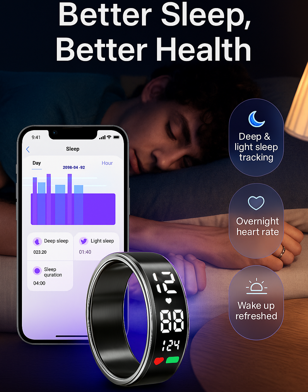 Track deep & light sleep, monitor your overnight heart rate, and wake up feeling truly refreshed all with the Smart Ring.